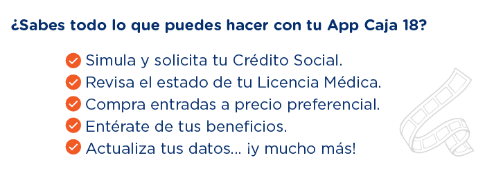 Beneficios exclusivos para afiliados a Caja 18. Considera un máximo de 18 Beneficios que serán sorteados entre los afiliados participantes que efectúen la descarga de la Aplicación Móvil de Caja 18 desde Apple Store y/o Android en cualquier teléfono inteligente o que ingresen a la misma, y que actualicen o confirmen sus datos personales a través de la misma aplicación móvil, entre el 05/11/2025 y el 16/11/2025. *18 entradas dobles de CinePlanet sólo para entradas a películas 2D (excepto para películas identificadas con una R de color rojo en su cartelera www.Cineplanet.cl), que serán sorteadas el día martes 18 de noviembre del año 2025. Términos y condiciones del uso de las entradas en www.cineplanet.cl. El Beneficio no es canjeable por efectivo ni por otros bienes. Mayor información sobre requisitos de participación, fechas de los sorteos y sus participantes, y otorgamiento de los Beneficios, en Bases Prestación Adicional “Para tener un tiempo de recreación, Caja 18 te invita al cine”, Reglamento del Régimen de Prestaciones Adicionales, y Programa Anual de Prestaciones adicionales 2025, el cual puede ser modificado durante el trascurso del año; en www.caja18.cl y sucursales Caja 18. Otorgamiento del crédito social sujeto a la política de crédito vigente y capacidad de endeudamiento del afiliado pensionado y/o trabajador a Caja 18 a la fecha de su solicitud. Mayor información sobre documentos requeridos, requisitos y condiciones en sucursales de Caja 18, a través de nuestro sitio web www.caja18.cl, o llamando al Call Center 600 718 18 18 y Reglamento de Crédito Social. Las Cajas de Compensación son fiscalizadas por la Superintendencia de Seguridad Social (www.suseso.cl).