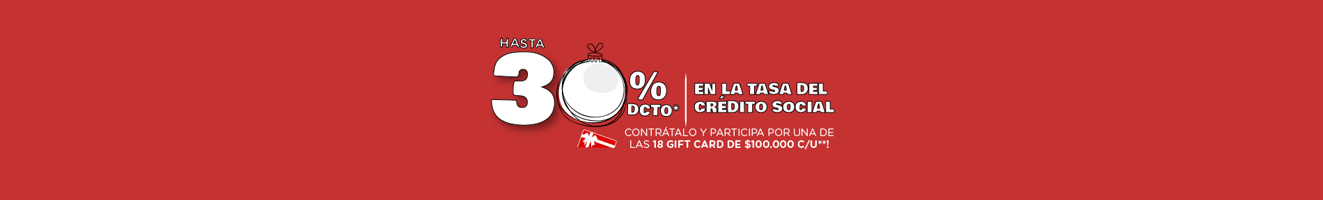 Exclusivo para trabajadores y pensionados afiliados a Caja 18. Otorgamiento y monto del crédito sujeto a políticas de crédito vigentes y a capacidad de endeudamiento del afiliado a la fecha de su solicitud. * Promoción aplica descuentos de hasta un 30% sobre las tasas de referencia de afiliados trabajadores y afiliados pensionados (vigentes entre el 01/11/2025 y el 30/11/2025, ambas fechas inclusive), sólo para créditos sociales contratados entre los días 01/12/2025 y 31/12/2025 ambas fechas inclusive. **El sorteo de 18 gift card de Cencosud de $100.000 cada una, serán sorteadas el día martes 6 de enero de 2026. Plazo para cobro de cada premio 06/02/2026. Las Gift Card podrán ser utilizadas para compras presenciales o a través de los sitios web de los establecimientos comerciales, Jumbo, Santa Isabel, Easy y París, con vigencia hasta el 26 de noviembre de 2026. Términos y condiciones del uso de la Gift Card en www.giftcard.cl. El Beneficio no es canjeable por efectivo ni por otros bienes. Mayor información sobre documentos requeridos para el otorgamiento de créditos, requisitos, condiciones, y bases legales de la promoción “Celebra Navidad con Caja 18”, en nuestras sucursales, sitio web www.caja18.cl, o call center 6007181818.